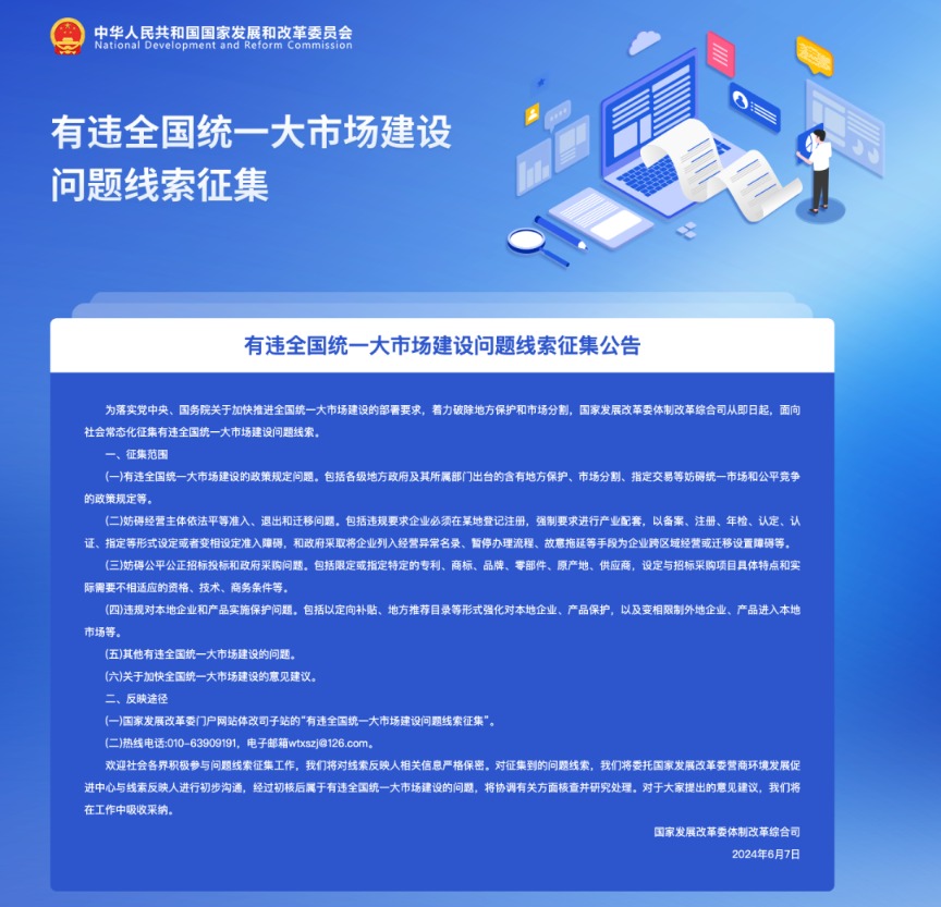 同时,《通知》还要求各省级发展改革、商务、市场监管部门在政府门户网站、政务服务APP和小程序发布《市场准入壁垒清理整治行动问题线索征集公告》,并在各级地方政府政务服务大厅显著位置张贴,进行广泛宣传,提升社会知晓度。