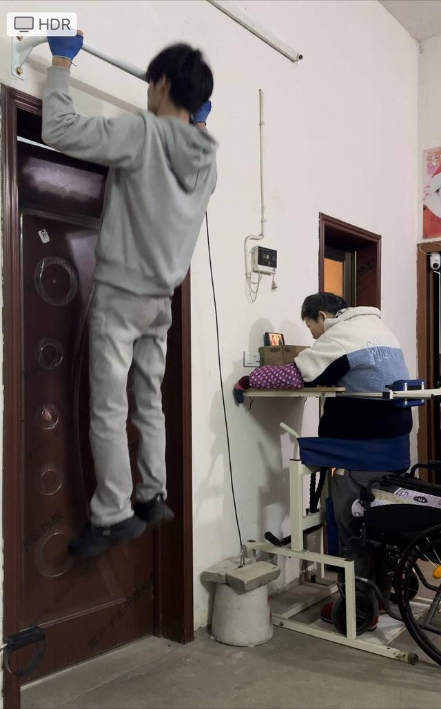 母亲右脚完全动不了,平时需要上下床或起身都需要他抱上抱下:“我身高1.73米、100斤,我妈1.64米、120斤,刚开始抱着还是挺费力的,腰痛得不行。”为了更有力量抱母亲,他从今年1月开始健身,主要练背和上肢。一年下来,他手臂和背部的肌肉更加明显,引体向上从勉强能做一两个到轻轻松松做十个,抱母亲也抱得更稳了。