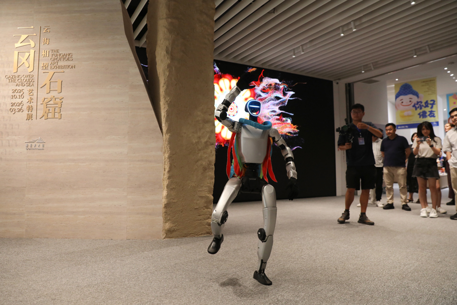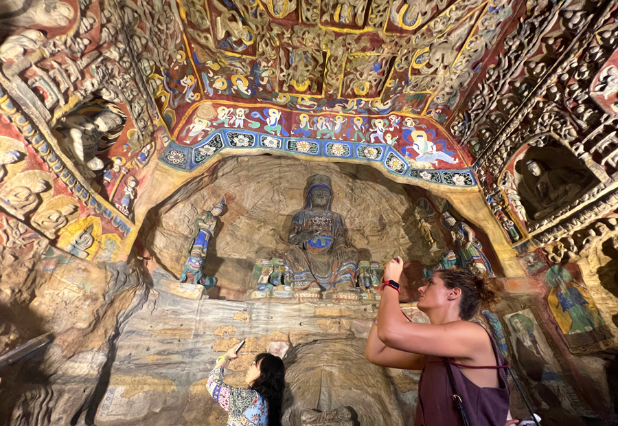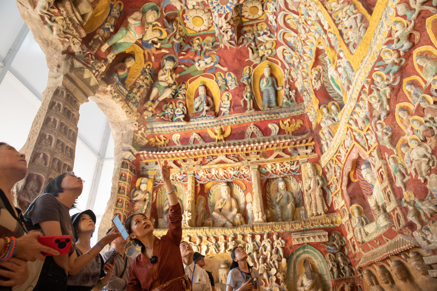 户外展区以云冈第12窟“音乐窟”为核心,呈现全球首例可移动3D打印1:1复制洞窟。观众可自由探索千年石窟细节,欣赏北魏天宫伎乐翩翩起舞。